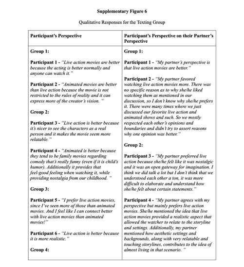 In the texting group, which consisted of eight participants, partners were assigned to each participant, resulting in the development of four groups. In the preliminary short answer questions, participants were asked to include their thoughts on whether live action or animated movies are better. Following the conclusion of the discussion, partners were asked to share their partner’s perspective on this topic in the postliminary survey. Each member of the texting group provided screen recordings of their messages with consent, which made it so that the conversations could be analyzed for patterns. For the texting groups, there was an attempt made by all participants to understand their partner’s perspective, even when it differed from their own. For instance, as shown in Supplementary Figure 6, this can be observed with Group 4 that texted “that’s true I agree there’s more flexibility in animation” and “ohhh yeah i agree.” Texting groups had more discussions compared to the face-to-face group. However, in the texting group, conversations occasionally got off topic. For instance, as presented in Supplementary Figure 6, in Group 3, individuals began talking about YouTube. In the texting group, when individuals felt strongly about a certain subject but were unable to express their feelings through body language, they used all caps and emojis to communicate. This was primarily evident in Group 2’s discussion with the use of the thumbs-up and heart emojis to illustrate agreement.